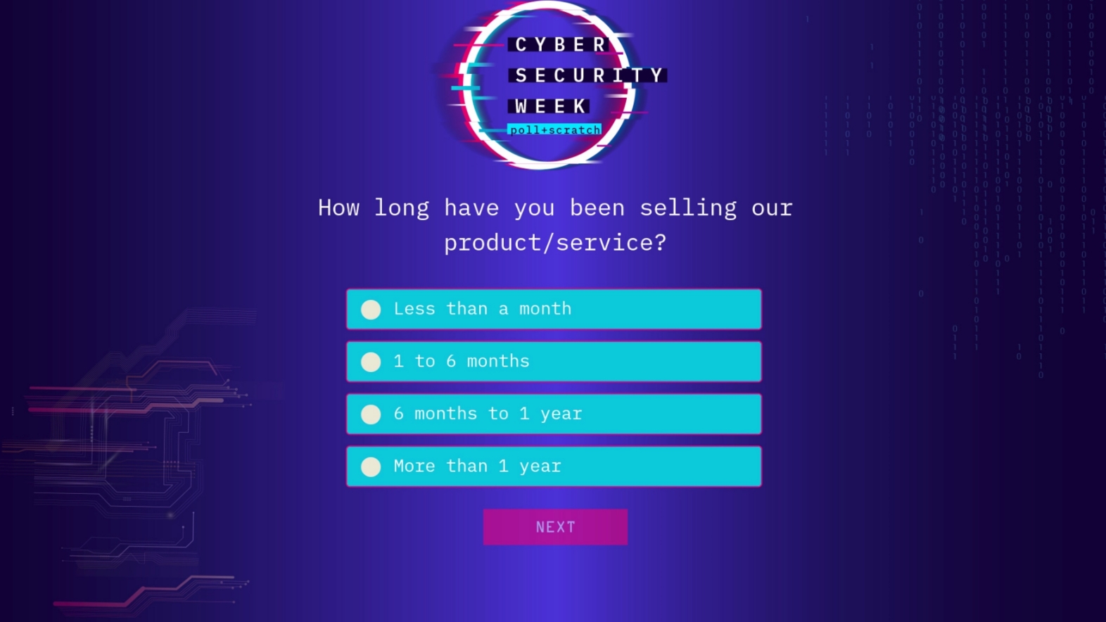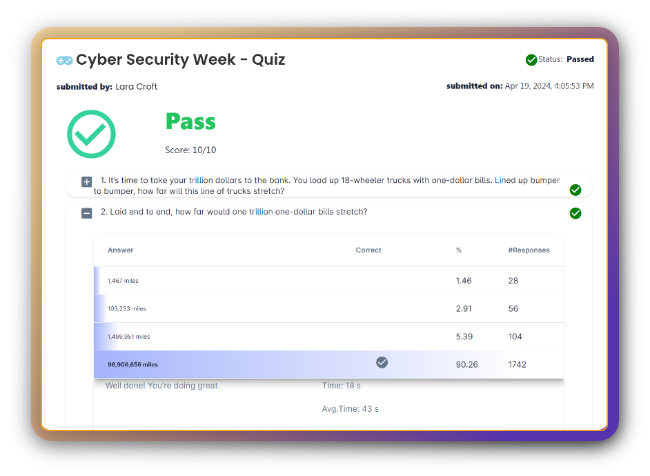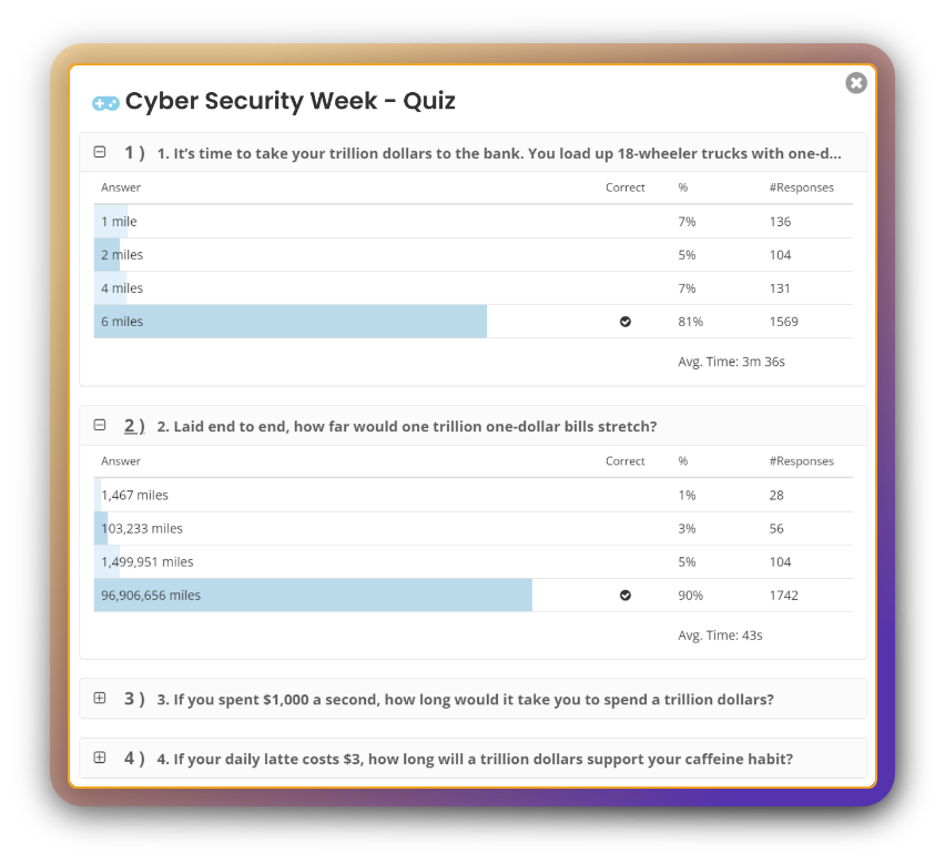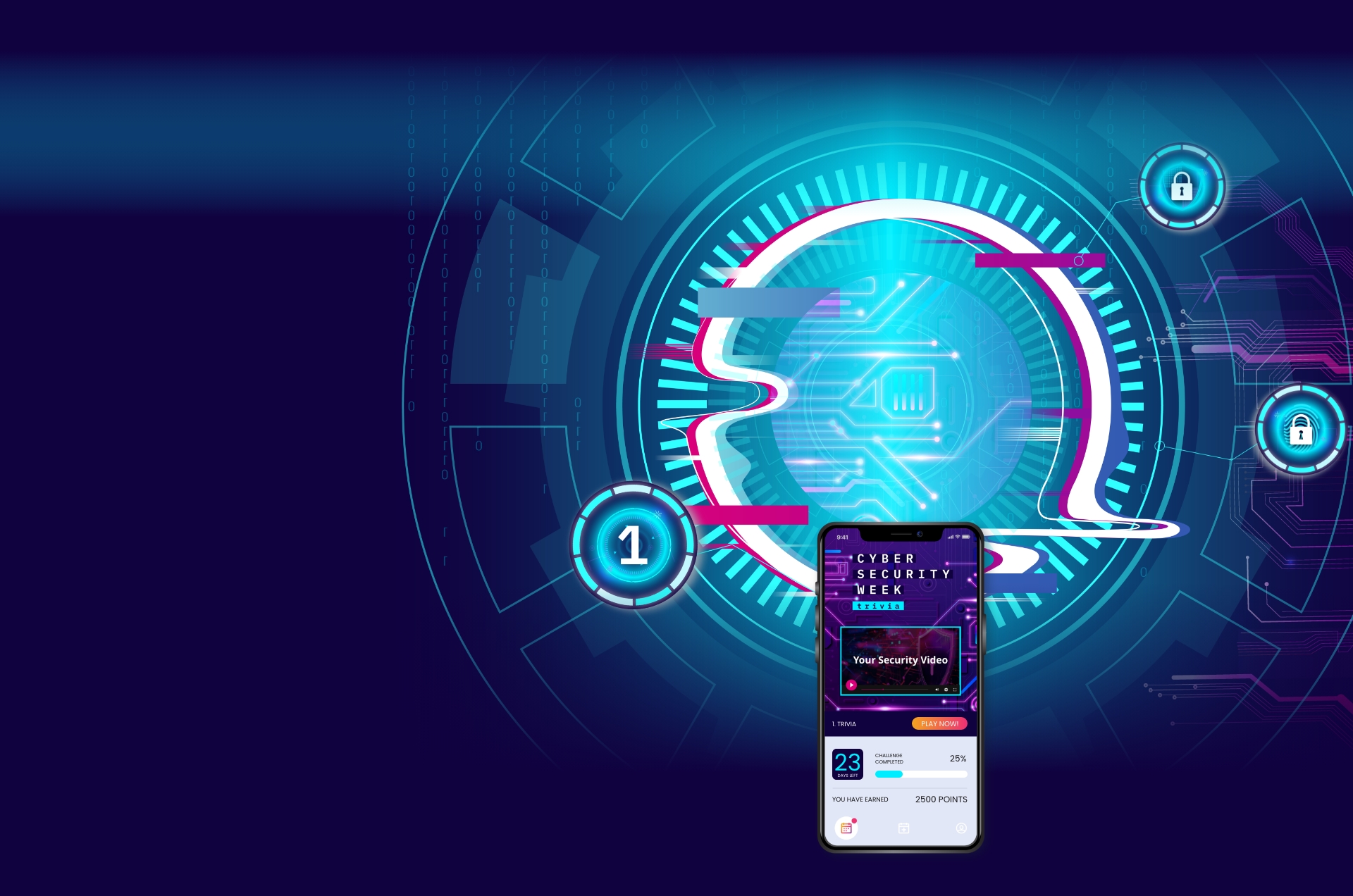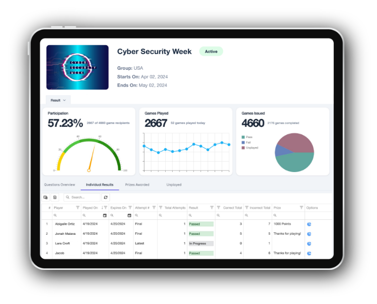 1 2 3 All content customized to your specific objectives. Schedule a demo and get the fun started! your participants have 30 days to complete their Challenge Watch the product video and test your knowledge. Trivia Please our match game and identify cyber-threats to learn how to avoid disaster. Match + learn Take our quick poll and play scratch to win. Poll + Scratch