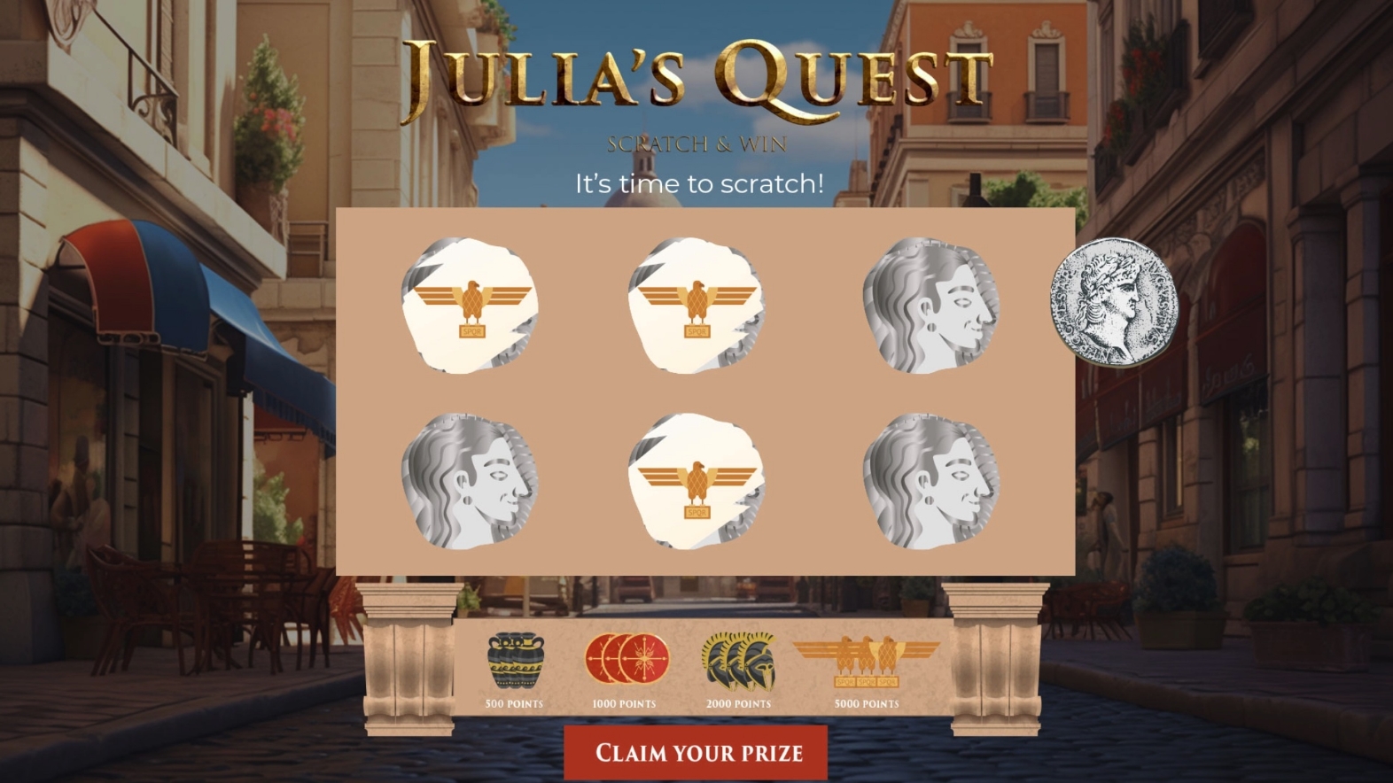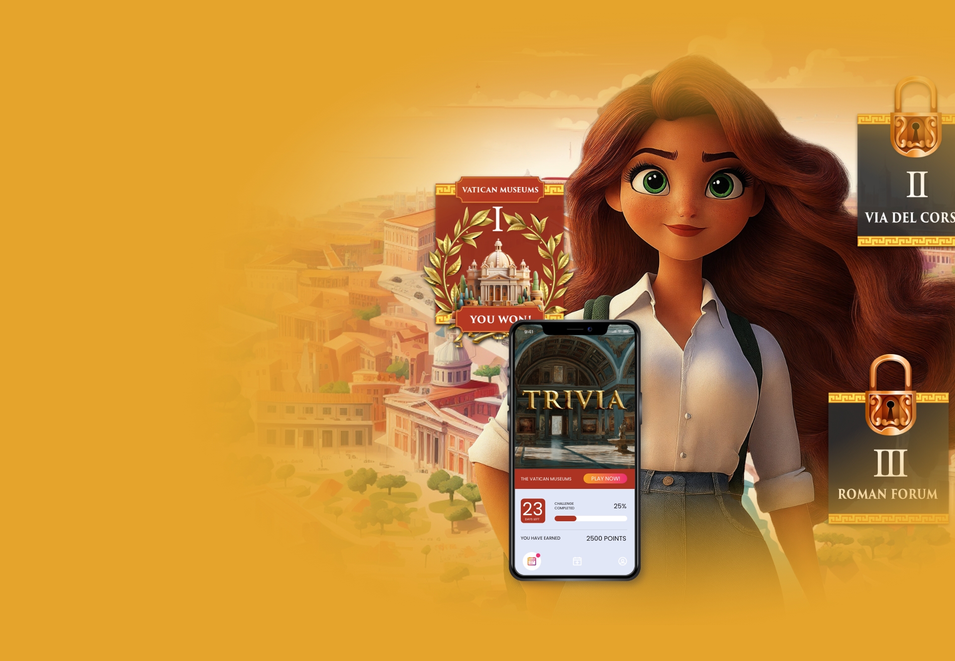 1 2 3 All content customized to your specific objectives. Schedule a demo and get the fun started! your participants have 30 days to complete their mission Watch the product video and test your knowledge. The Vatican Museums Play Scratch & Win. Via Del Corso Play the Slots. Roman Forum