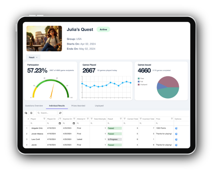 One Micro-learning Game remove One Sales Performance-based Game One Poll Game remove Prizing Options Ideal for Learn & Earn, New Product Launch, Milestone attainment, Sales Kick-Off, Onboarding new reps., etc. The Julia’s Quest Mission is fully customizable to your content and objectives, with prizes and odds to fit your budget. In the animated wonderland of Rome, we meet Julia, a spirited young travel agent, unwinding at a quaint café. As she savours her downtime, an enigmatic message materializes on her phone, luring her into an adventurous pursuit of a mysterious amulet hidden somewhere in the Eternal City.