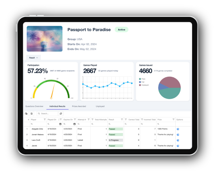 The Passport to Paradise Challenge is fully customizable to your content and objectives, with prizes and odds to fit your budget.